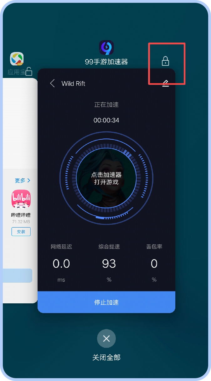 1、打开99加速器并打开后台程序,点击“锁”图标,将99加速器锁定在后台